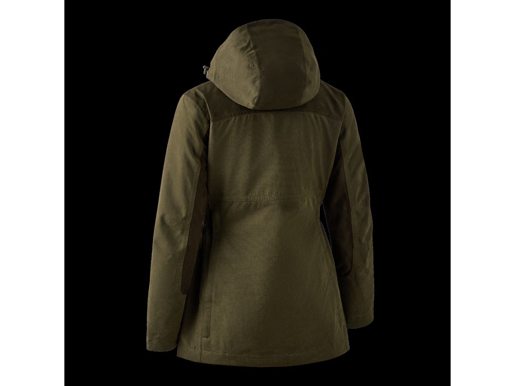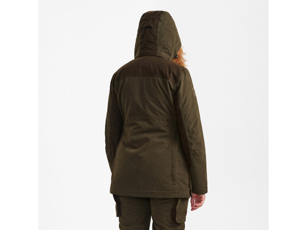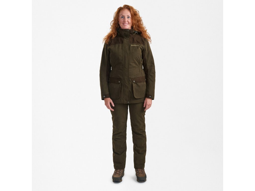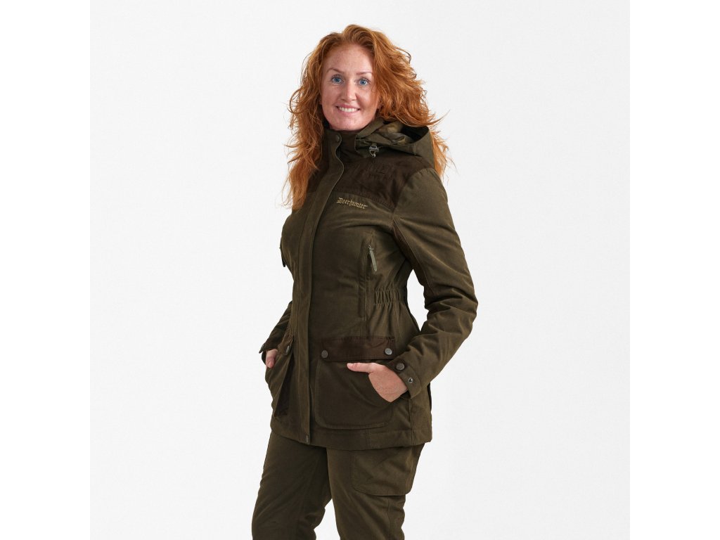 Bunda Lady Eagle, ikonický štýl prispôsobený pre lovkyne, je vyrobená pre pohodlie počas aktívnych poľovačiek za každého počasia. Je dostupná pre začiatočníkov, ako aj pre skúsených lovcov, ktorí vyžadujú všestrannosť. Je navrhnutá tak, aby vám udržala pohodlie a sústredenosť a chránila vás pred živlami. Detaily z imitácie semišu umocňujú klasický poľovnícky štýl, zatiaľ čo membrána Deer-Tex® Performance Shell zaisťuje, že bunda je vetruodolná, nepremokavá a priedušná, čím poskytuje poľovníkovi príjemnú vnútornú klímu. Pridajte k tomu množstvo praktických prvkov, ako je vrecko na vysielačku s popruhom na anténu, dve priestranné vrecká na prednej strane pre ľahký prístup, vrecko na lov so skrytým zipsom na oboch stranách pre jednoduché použitie a viacero vnútorných a vonkajších vreciek so zapínaním na zips, takže poľovnícke nevyhnutnosti sa dajú pohodlne uložiť a ľahko získať počas lovu. Nastaviteľné manžety, elastické panely v páse a predtvarované lakte zaisťujú dobré a lichotivé nosenie, zatiaľ čo odnímateľná kapucňa vyhovuje každému osobnému štýlu. Všestranná bunda Lady Eagle, navrhnutá pre použitie vo všetkých ročných obdobiach, je poľovníckou nevyhnutnosťou v šatníku každého poľovníka.Dodatočné parametre