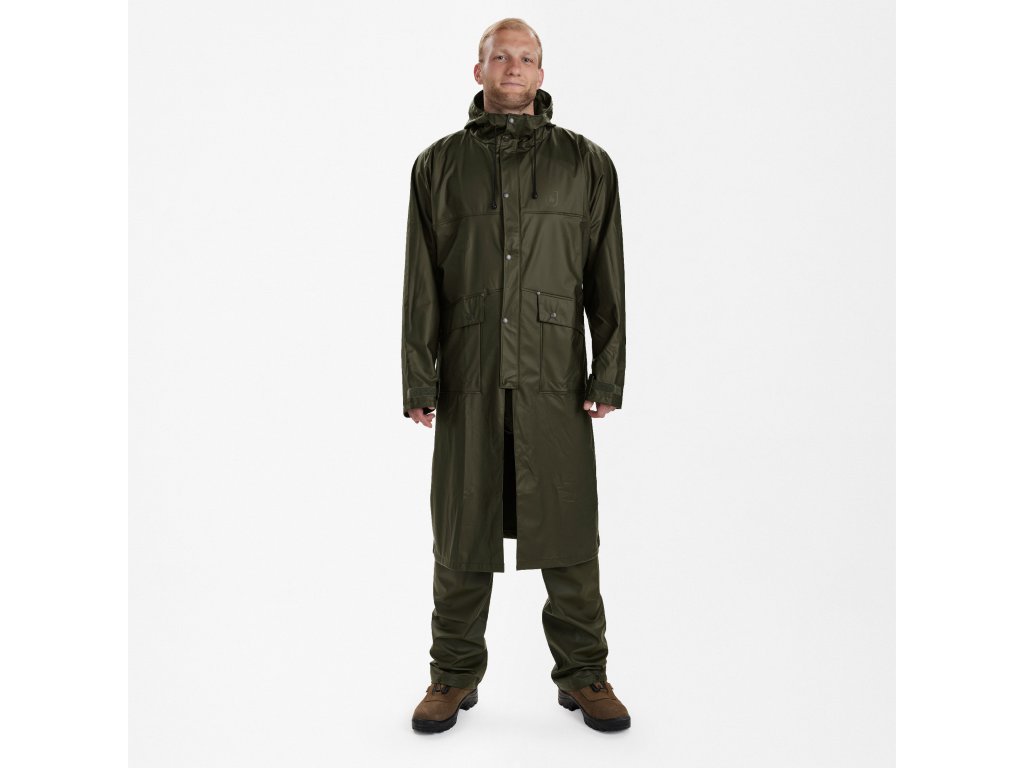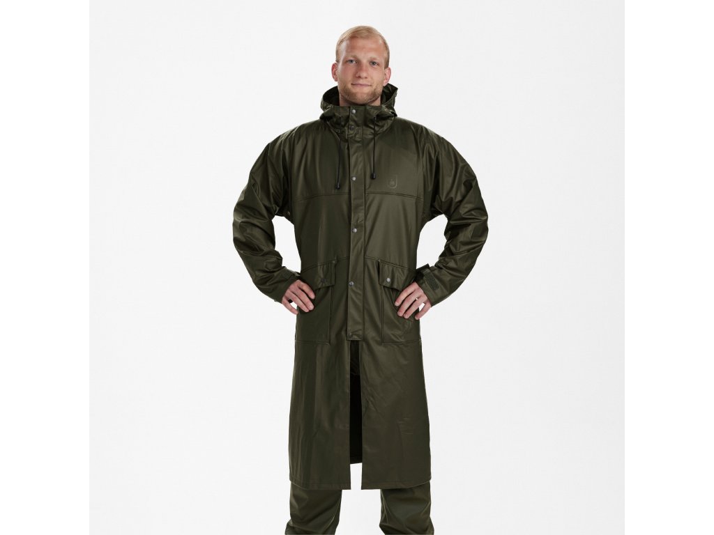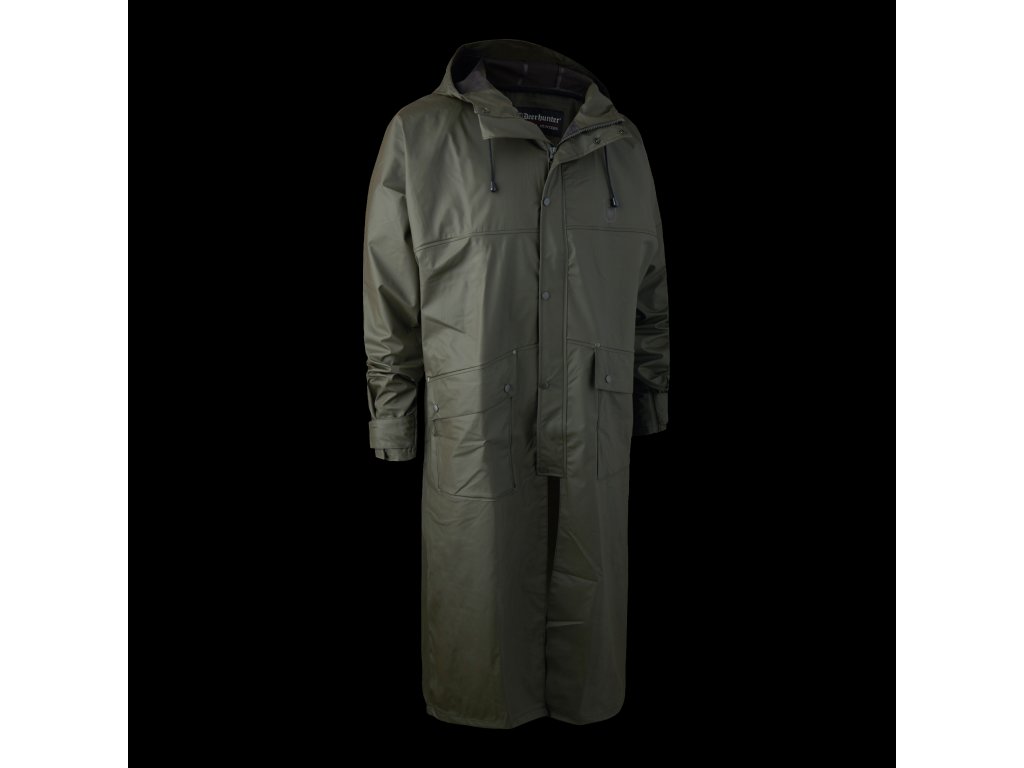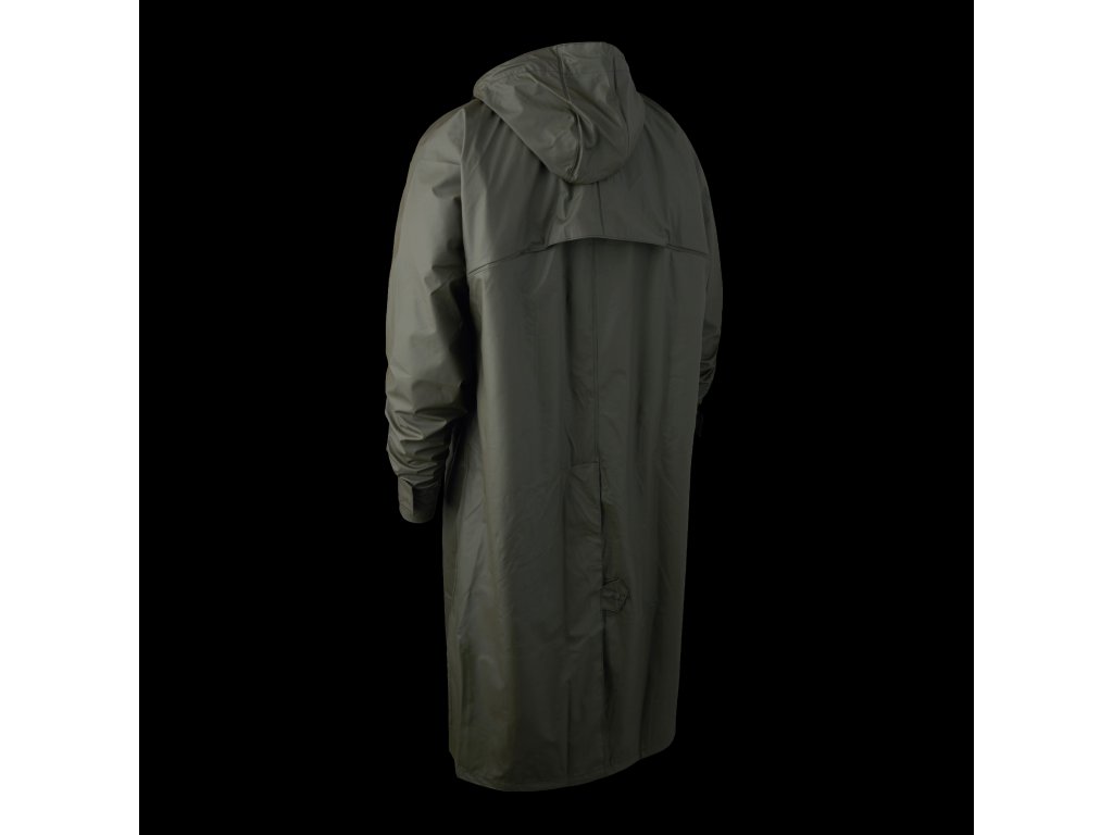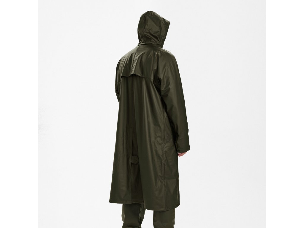 Dlhý pršiplášť s kapucňou a vetraním vzadu - 100% vodeodolný pršiplášť s kapucňou v jednofarebnej zelenej farbe s PU záterom. Predné vrecká na gombíky a vetranie vzadu a pod pazuchou. Možno prať v práčke.Dodatočné parametre