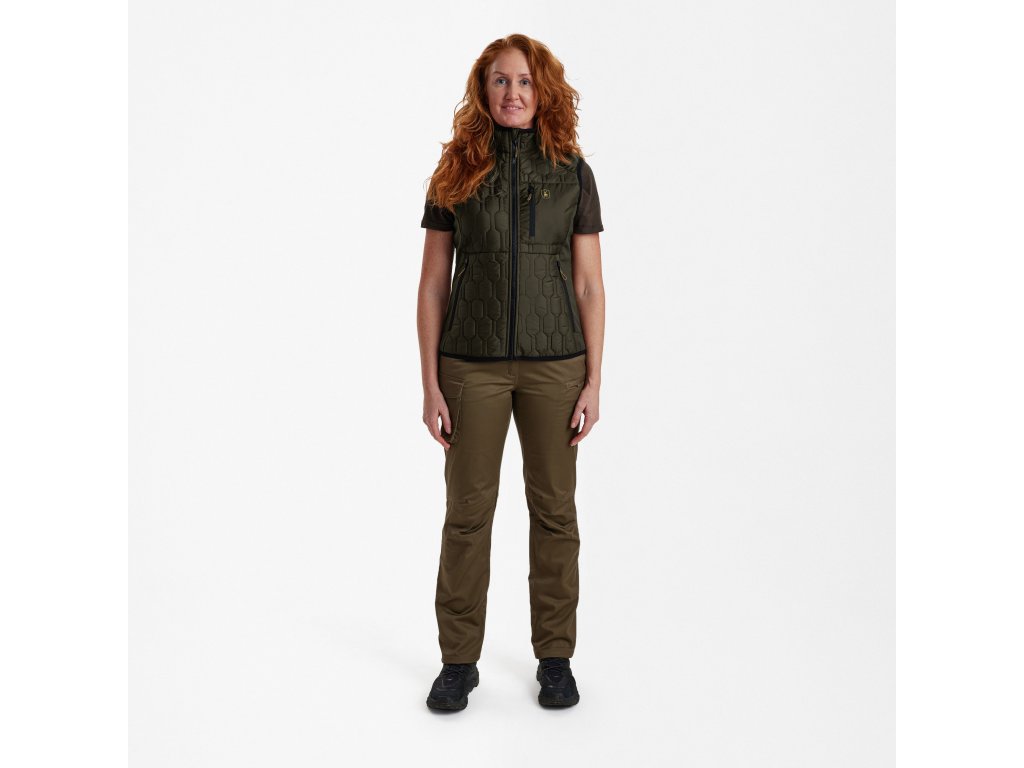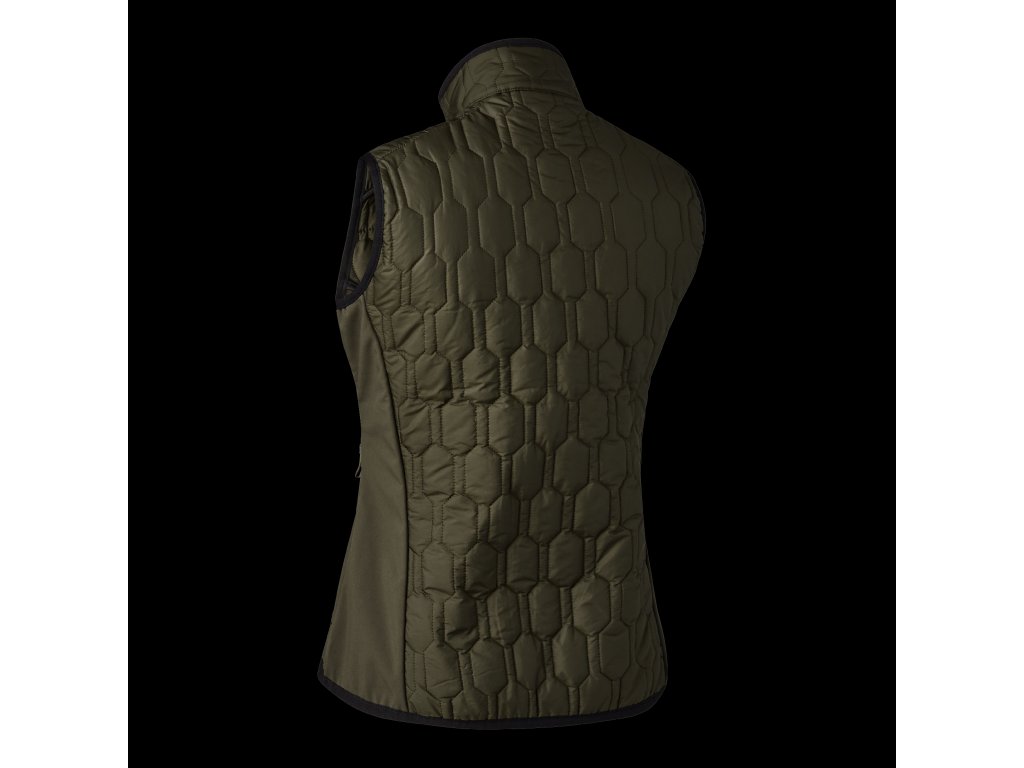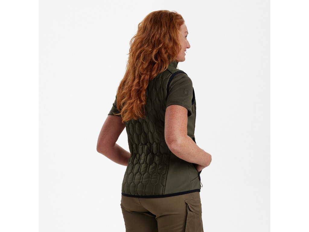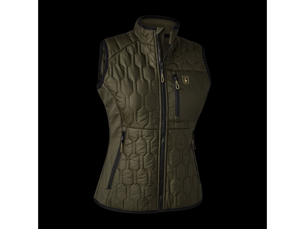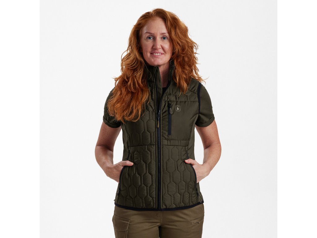Moderná verzia klasickej prešívanej vesty, prešívaná vesta DEERHUNTER Lady Mossdale, sa vyznačuje výrazným vzorom z prešívanej a softshellovej tkaniny s regenerovaným polyesterom pre maximálne pohodlie a teplo. Táto vodeodolná, zateplená vesta je vyrobená na outdoorové aktivity alebo každodenné dobrodružstvá. S dostatkom vreciek na každodenné nosenie je praktická aj štýlová.Dodatočné parametre
