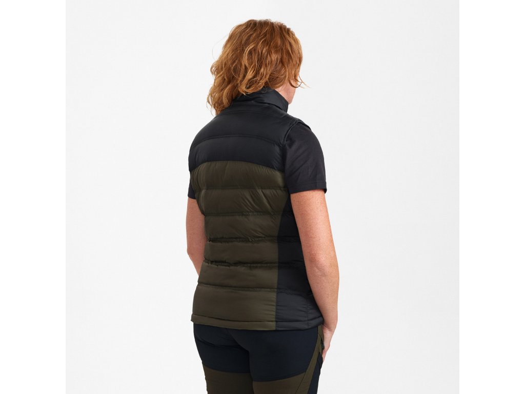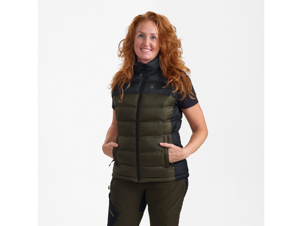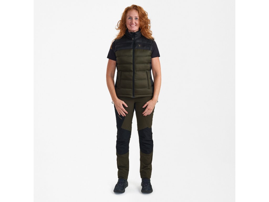 Vesta Lady Northward Padded Waistcoat, ktorá spája odborné znalosti materiálov DEERHUNTER a funkčný dizajn, sa môže pochváliť výnimočným pohodlím a izoláciou vďaka našej charakteristickej výplni DEER-TEX® Temp, ktorá zaisťuje mimoriadnu mäkkosť a zároveň udržiava telesné teplo vo viacvrstvovej štruktúre, ktorá izoluje telo. Vďaka kontrastnému sedlu a bočným panelom, lichotivému strihu a vodoodpudivej úprave je to štýlová aj praktická voľba. Táto vesta je ideálna na nosenie v medzisezónnych obdobiach alebo ako izolačná stredná vrstva počas zimy. Je navrhnutá tak, aby chránila pred chladom a zároveň si zachovávala štýlový vzhľad pri outdoorových aktivitách, voľnočasových aktivitách alebo bežných aktivitách.Dodatočné parametre