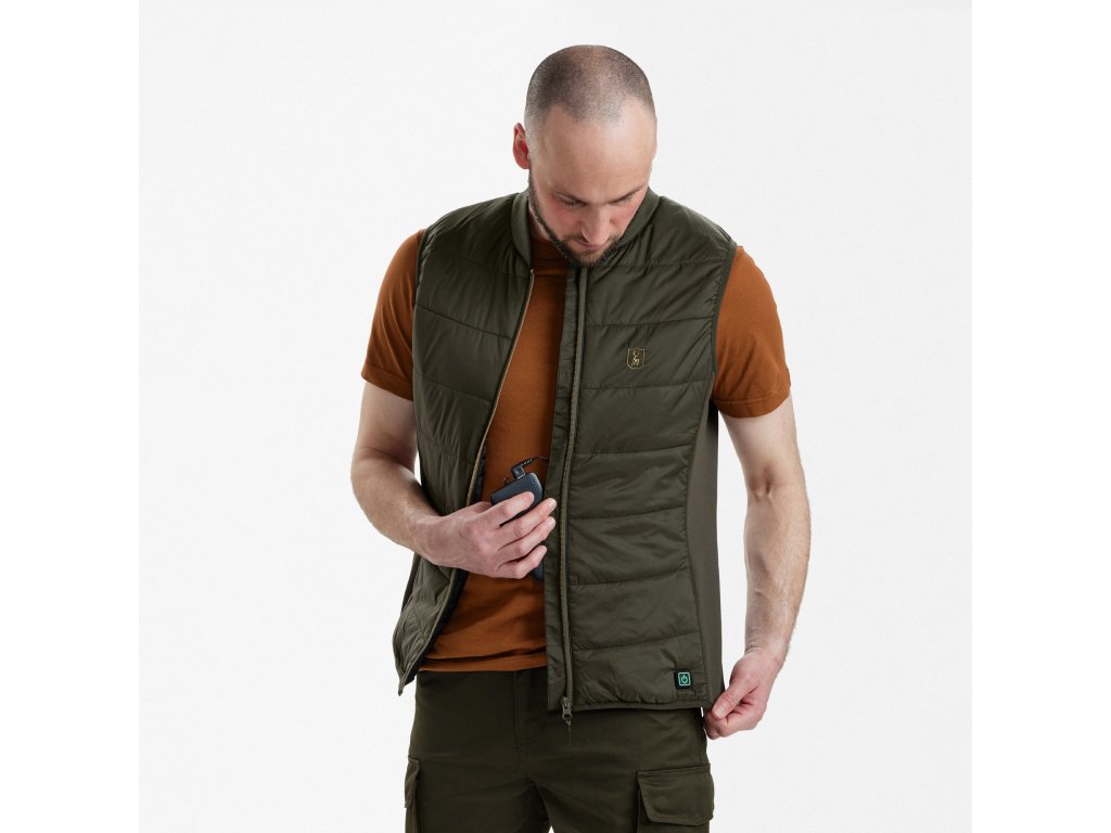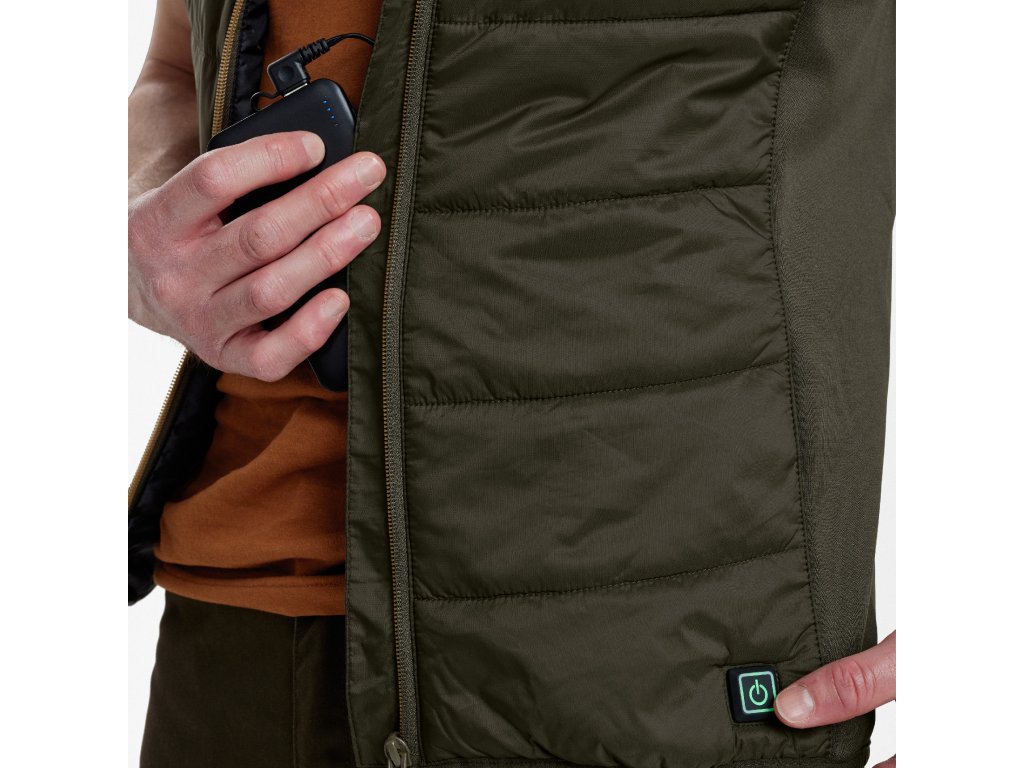 Vnútorná vesta DEERHUNTER Heat má integrovaný systém HEAT, ktorý sa aktivuje na ľavej strane vesty jediným kliknutím. Intenzita tepla je nastaviteľná a znázornená vstavaným LED svetlom, ktoré indikuje tri úrovne tepla vesty. Vesta sa zapína na zips na prednej strane, má vodeodolnú povrchovú úpravu a je vyrobená z flexibilnej tkaniny na oboch stranách, čo poskytuje vysoký stupeň voľnosti pohybu a pohodlia.Dodatočné parametre