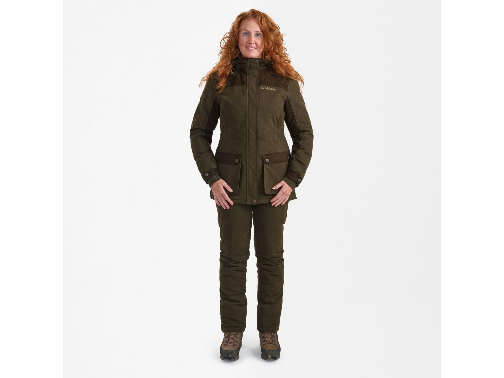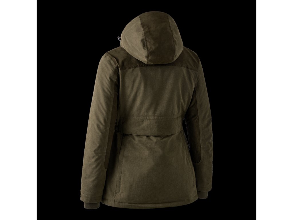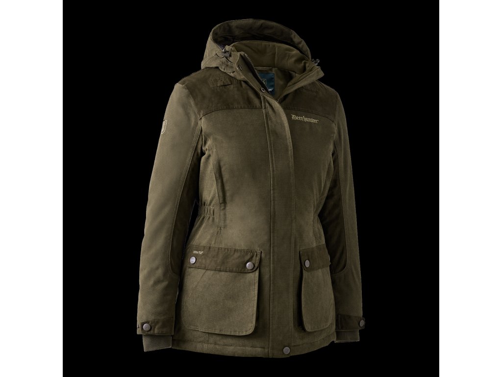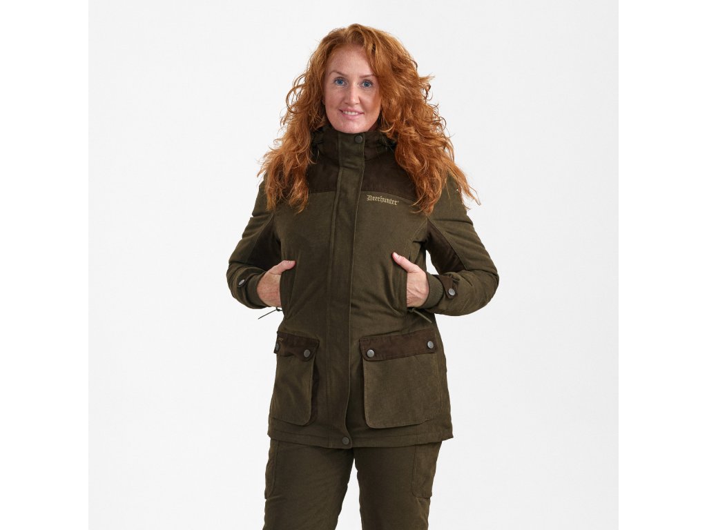 Zimná bunda Lady Eagle, vyrobená do chladných podmienok, spája klasický poľovnícky štýl so ženským strihom v kombinácii s moderným teplom a praktickosťou. Je izolovaná kombináciou priedušnej sieťoviny a prešívanej podšívky a zároveň odolná voči vetru a vode vďaka membráne Deer-Tex® Performance Shell, ktorá zaisťuje príjemnú vnútornú klímu pre aktívneho poľovníka za každého počasia. Detaily z imitácie semišu umocňujú klasický poľovnícky štýl a odnímateľná kapucňa vyhovuje každému osobnému štýlu. Elastické panely v páse ponúkajú lichotivý strih. Táto premyslene vyrobená a starostlivo navrhnutá pre výkon je plná funkčných prvkov, ako je nepremokavé, čiastočne odnímateľné a prateľné vrecko na lov, ktoré je vhodné aj ako podložka na sedenie, ktorá vás udrží v chlade pri sedení na stanovišti. Vrecko Napoleon je nielen praktické na uloženie všetkých potrebných vecí na dosah ruky, ale dve vrecká na ohrievanie rúk sú ľahko prístupné, aby ste ruky nemuseli prechladnúť, keď ich nepoužívate. Pridajte k tomu množstvo ďalších praktických detailov, ako je vrecko na vysielačku s popruhom na anténu, dve priestranné vrecká na prednej strane pre ľahký prístup a viacero vnútorných a vonkajších vreciek so zapínaním na zips, takže si počas lovu môžete pohodlne uložiť poľovnícke nevyhnutnosti. Zimná bunda Lady Eagle spája praktický výkon s klasickým štýlom a ženským strihom, čím poskytuje výnimočné pohodlie pri aktivitách v chladnom počasí.Dodatočné parametre